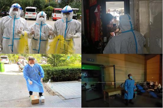 職工劉曉龍在金城街道牛市社區(qū)做防疫志愿者,維持社區(qū)秩序、分發(fā)物資,幫助協(xié)調(diào)解決居民生活需求